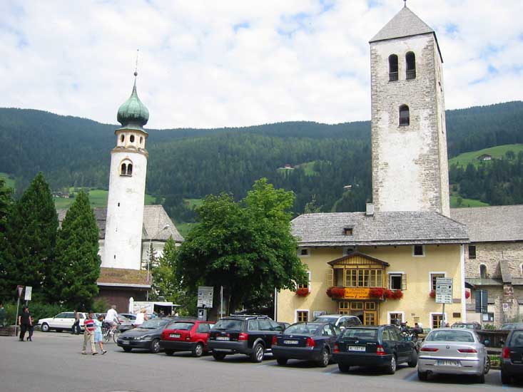 | Dosažení kóty 1525 mnm, pauza. Nyní bychom měli pokračovat po jižní straně Dolomit, pořád z kopce. Jak se později ukázalo, sjeli jsme sice více jak 800m výškově, ale pořád z kopce to rozhodně nebylo. Vedle kaplička se svéráznou impresionistickou výzdobou. |